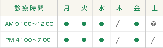 休診日: 木曜日・日曜日・祝日・土曜日午後 ○ 土曜日 AM 9:00~PM 1:00 ※PM 3:30~4:00 予約手術・検査 (月・火・水・金)