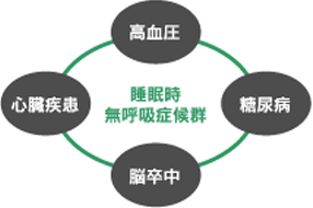 睡眠時無呼吸症候群(SAS)は高血圧、心臓病、脳卒中、糖尿病などの生活習慣病と密接な関係にあります。重症の睡眠時無呼吸症候群(SAS)の患者さんは約4割の方が合併症などのために、9年後に亡くなっているというデータがあります。睡眠時無呼吸症候群(SAS)はそのままにしておくと、生命に影響を及ぼすことがある、危険な病気なのです。