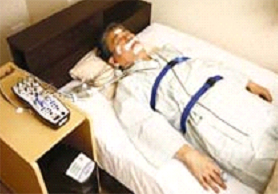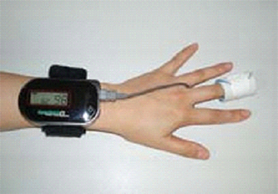 機械を貸し出ししてご自宅でおこないます。左の写真のように装着し、眠っていただきます。睡眠中の体内の酸素濃度を測定する機械です。酸素濃度の低下の回数により、大まかな睡眠中の無呼吸の回数を推定することができます。小さなお子さまでも検査可能です。スクリーニング目的の検査の為、この検査で異常があれば、入院検査が必要になります。